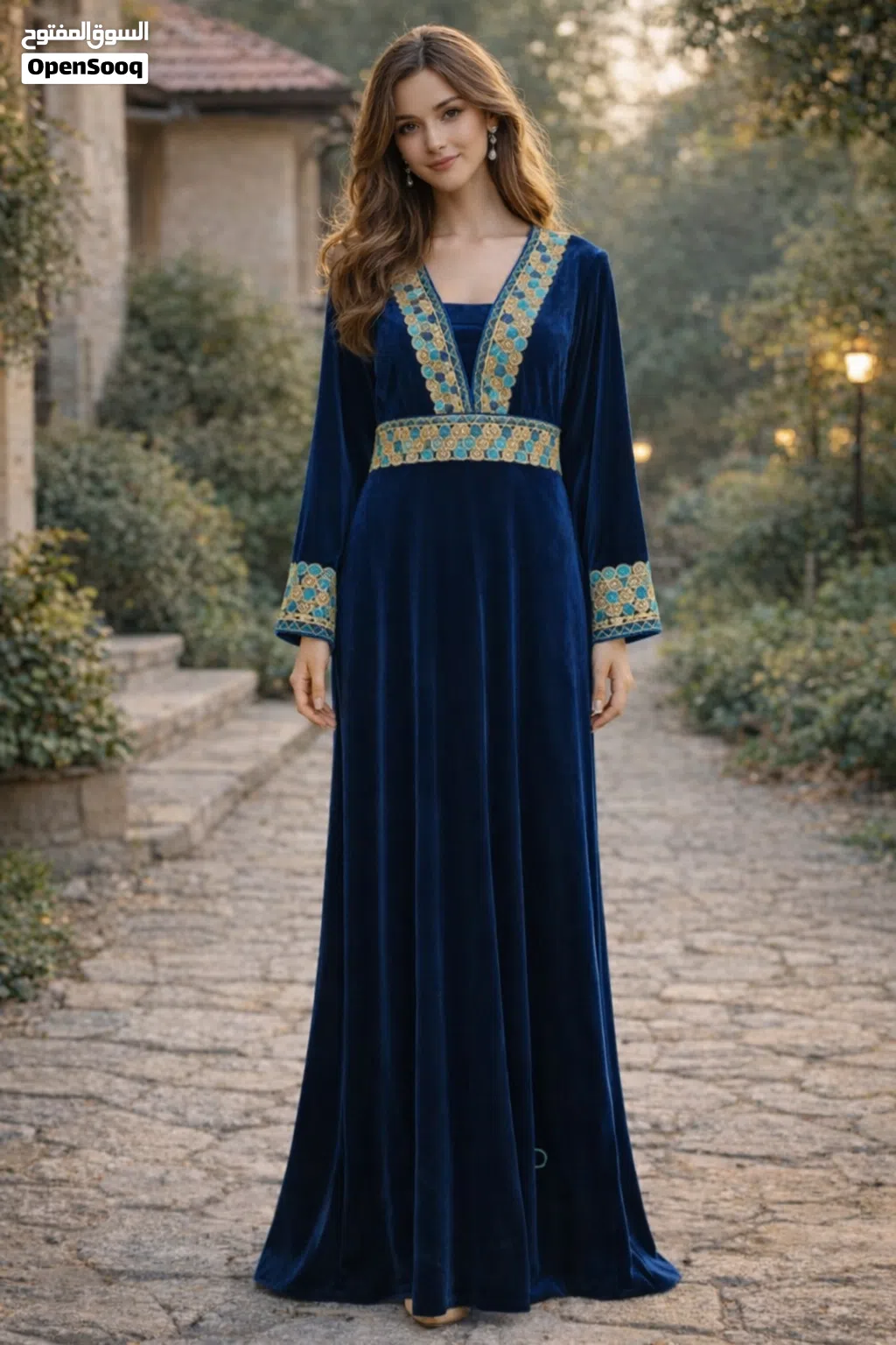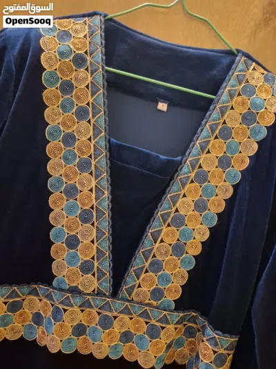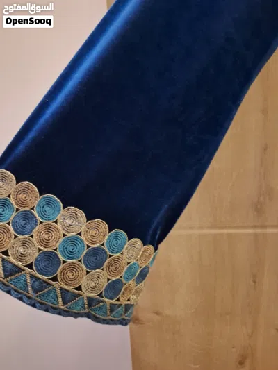 ثوب كحلي قماشه مخمل مطرز وأنيق، جديد وراقي.