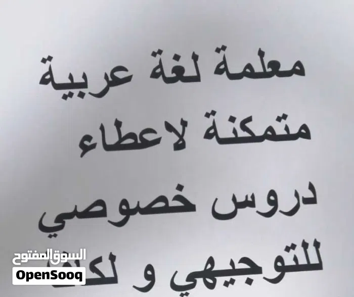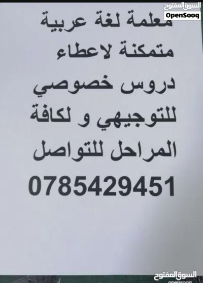 معلمة لغة عربية متمكنة لاعطاء دروس خصوصي لطالب واحد او مجموعة طلاب للتوجيهي والاكاديمي بأسلوب سلس وواضح وبسيط يحقق الفائدة بالاضافة الى امتحانات قصيرة وأوراق عمل ومتابعة مستمرة للمادة المعطاة وخبرة بالتصحيح الوزاري التواصل واتساب اضغط لإظهار رقم الهاتف 9627854294XX بالاضافة الي تدقيق لغوي ونحوي للابحاث باحترافية عالية واسعار مناسبة