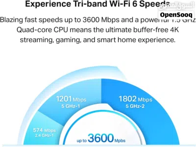 Tri-Band Speed: AX3600 (5 GHz: 1802 Mbps + 1201 Mbps; 2.4 GHz: 574 Mbps)