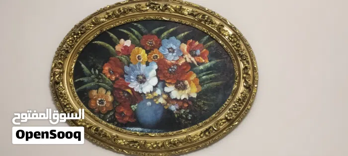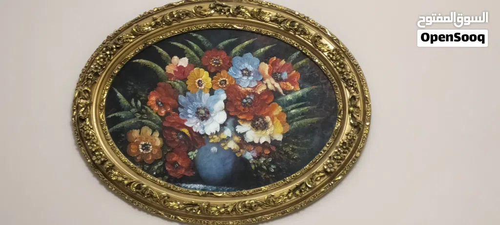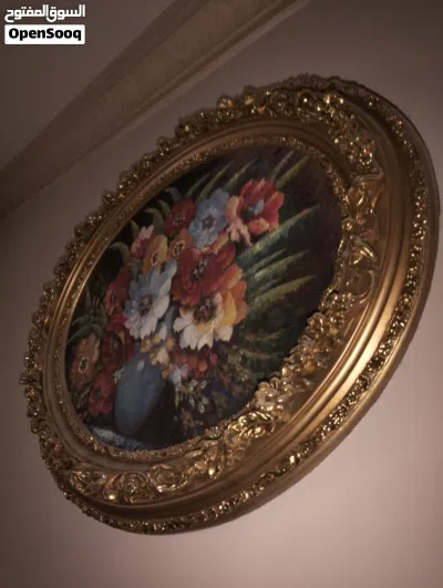لوحة زيتية رسم يدوي مع برواز فاخر جدآ حفر يدوي ملبس ورق ذهب . القطعة تخفة فنية
