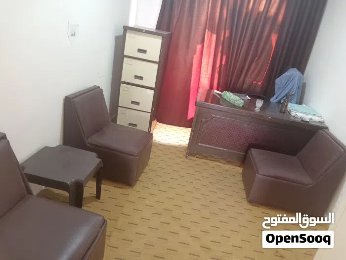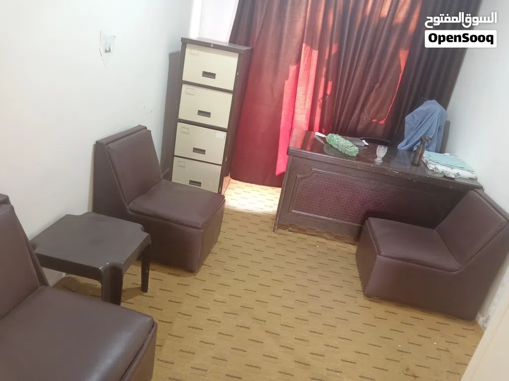 اثاث مكتب مكون من موكيته وكاله وثلاث كراسي وخزانه وطاوله مكتب وبرداي