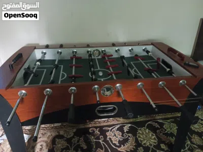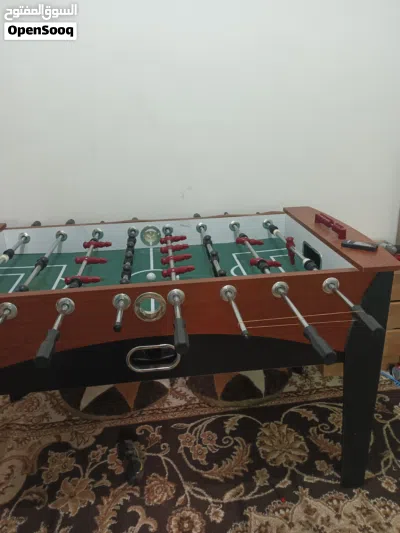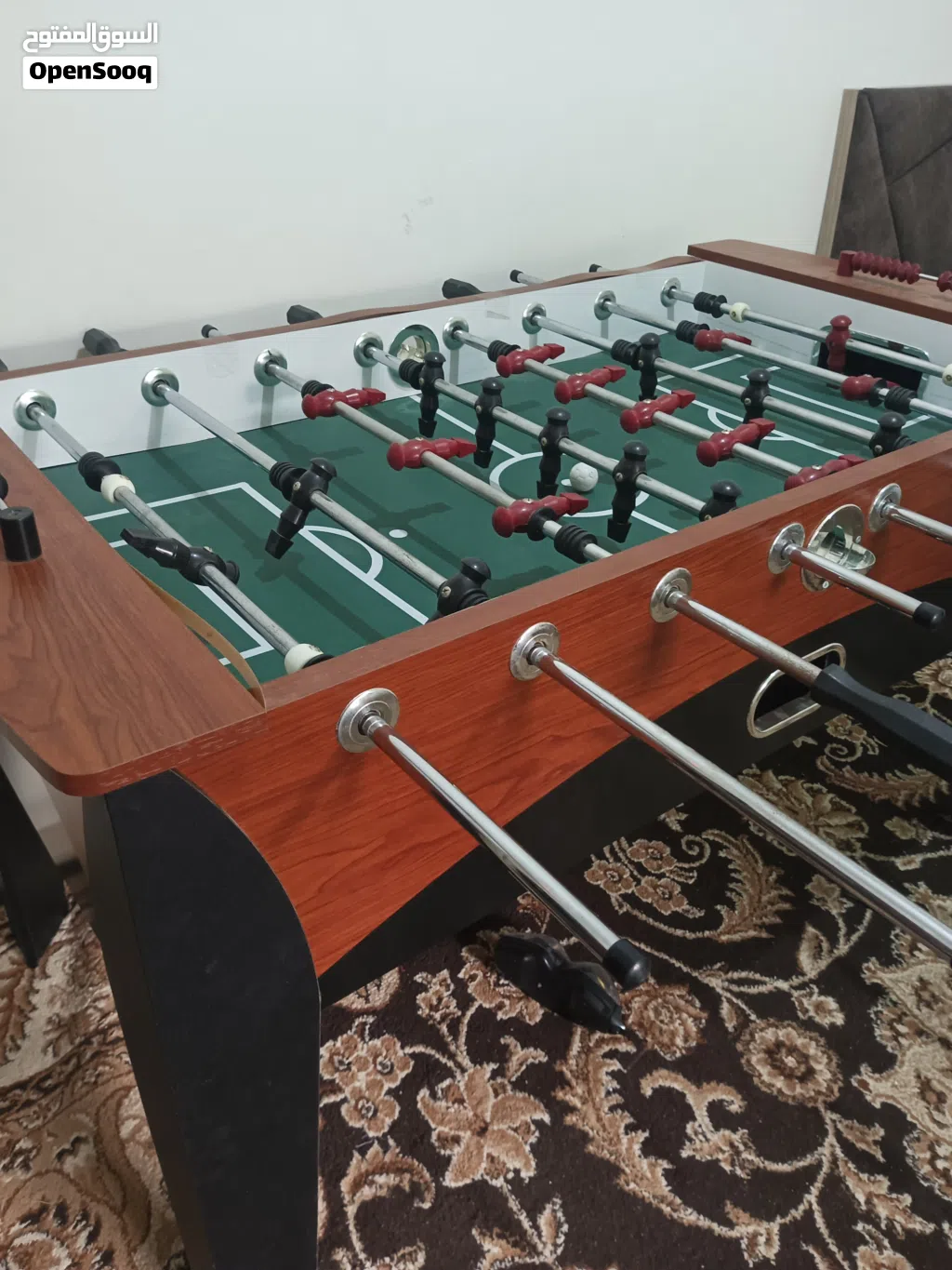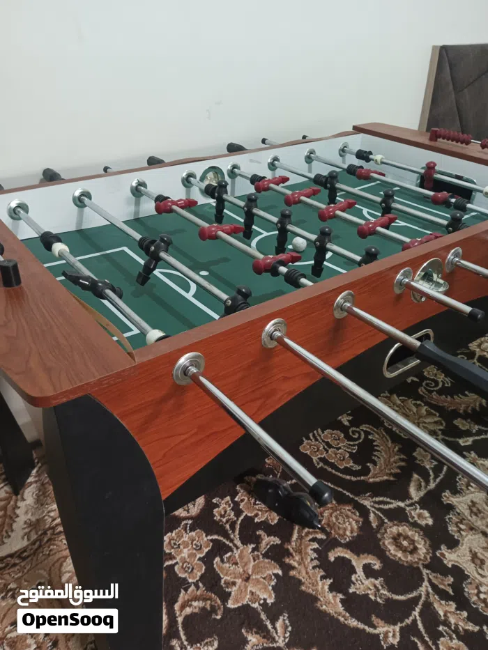 "طاولة فوسبول خشبية بتصميم أنيق، مزودة بلاعبين باللونين الأحمر والأسود على أرضية ملعب أخضر، جاهزة للعب والحماس داخل البيت."