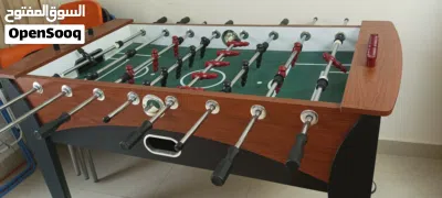 طاولة فوسبول (كرة القدم على الطاولة)، إلها شكل مستطيل مع تصميم جانبي بلون خشبي غامق