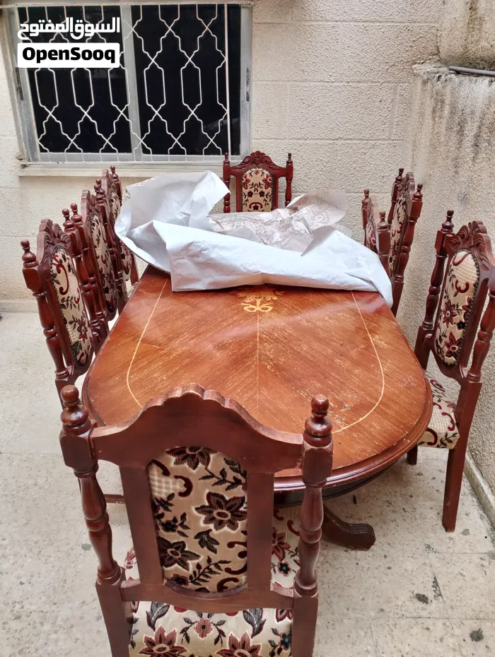 طاولة سفرة خشب ثقيله مع 8 كراسي بحاجة لصيانة خفيفة موجودة في عمان