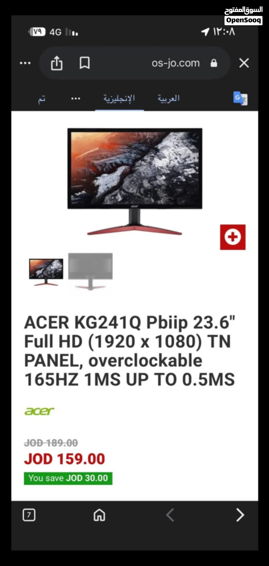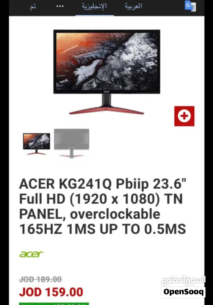 شاشة acer FHD 165hz سرعة استجابة 0.5 ms بحالة ممتازة وما فيها شخط