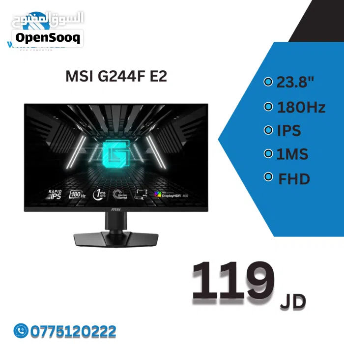 توفر MSI شاشة G244F E2 بحجم 23.8 بوصة ودقّة FHD مع معدل تحديث 180Hz وزمن استجابة 1ms، وذلك لتقديم أداء موثوق وسلس في الاستخدامات المكتبية والألعاب.