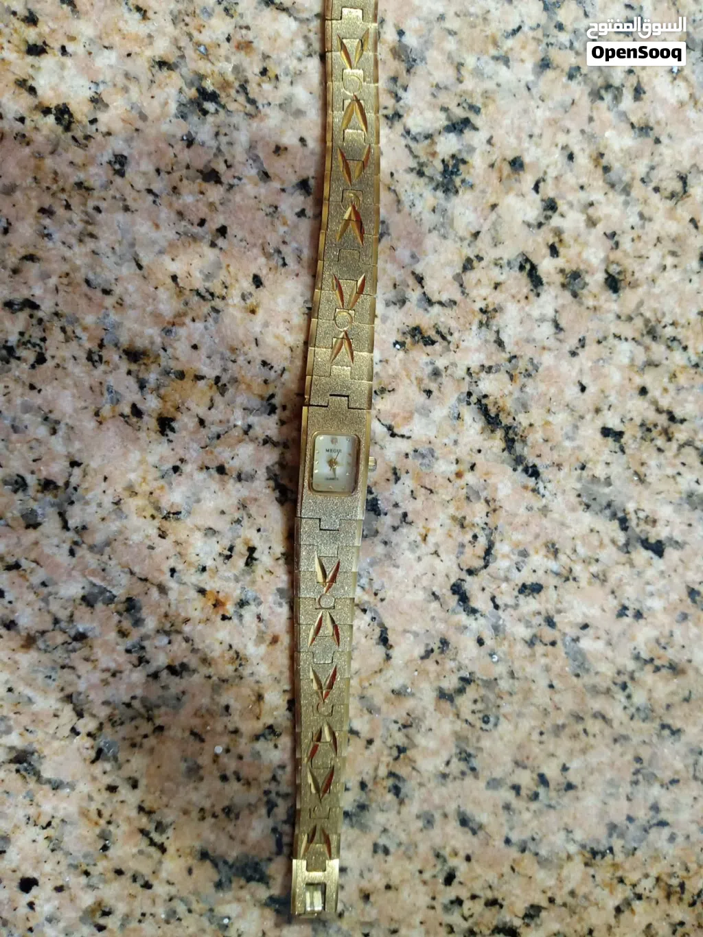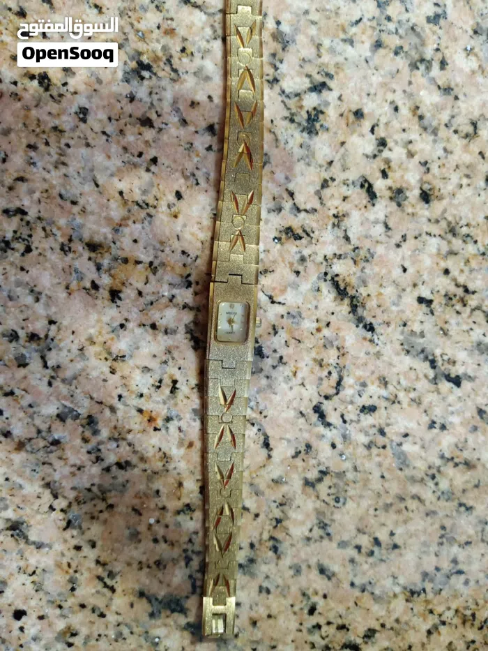 للبيع ساعة نسائية ماركة MEGIR موديل No. 5338، لونها ذهبي أنيق، الغطاء الخلفي ستانلس ستيل، مقاومة للماء، وبتشتغل بحركة Swiss Quartz. الساعة بحالة ممتازة وما عليها خدوش، شكلها كلاسيكي ومرتب، وبتصلح كإكسسوار فاخر بيكمل أي إطلالة سواء رسمية أو يومية.