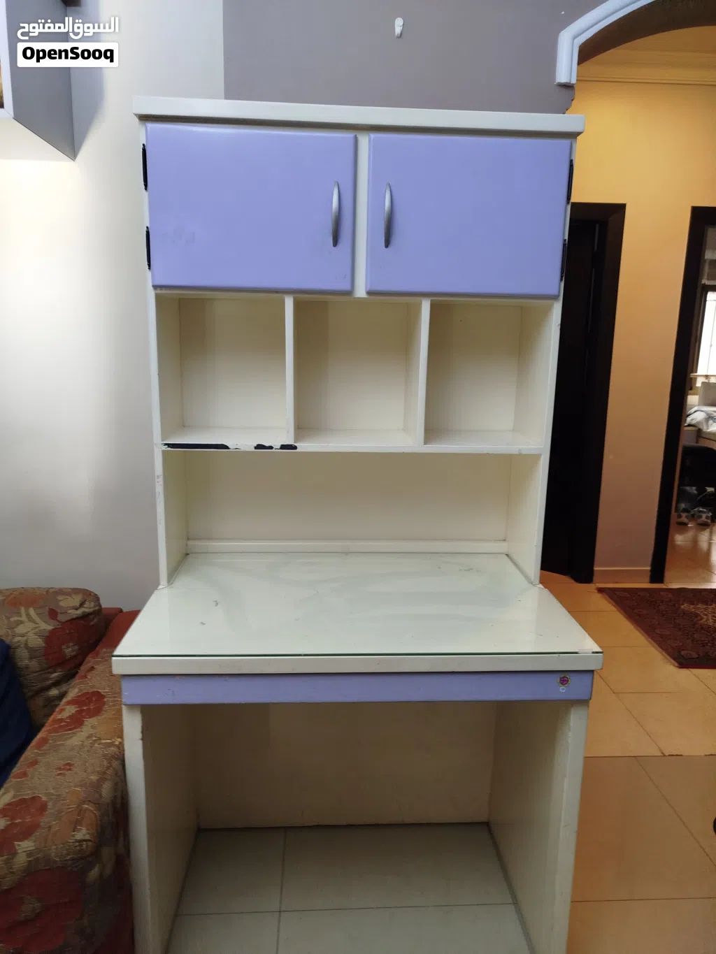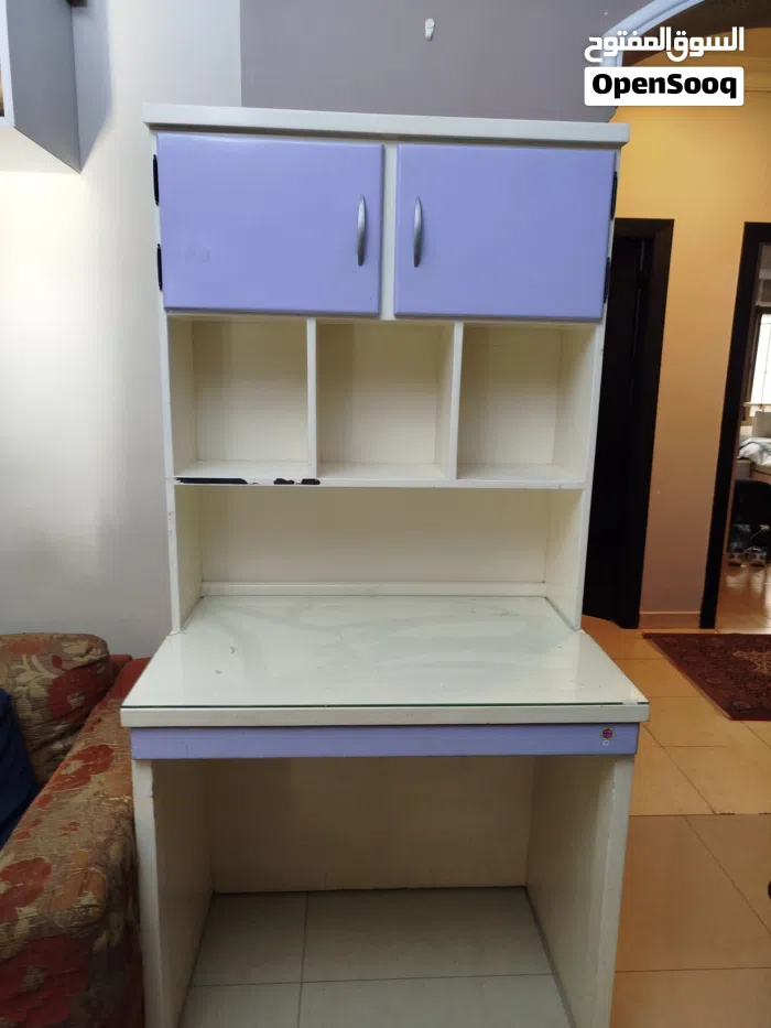 مكتب خشبي عملي مع أرفف وخزائن علوية، مناسب للطلاب أو المكتب المنزلي. بحالة جيدة مع آثار استعمال خفيفة.