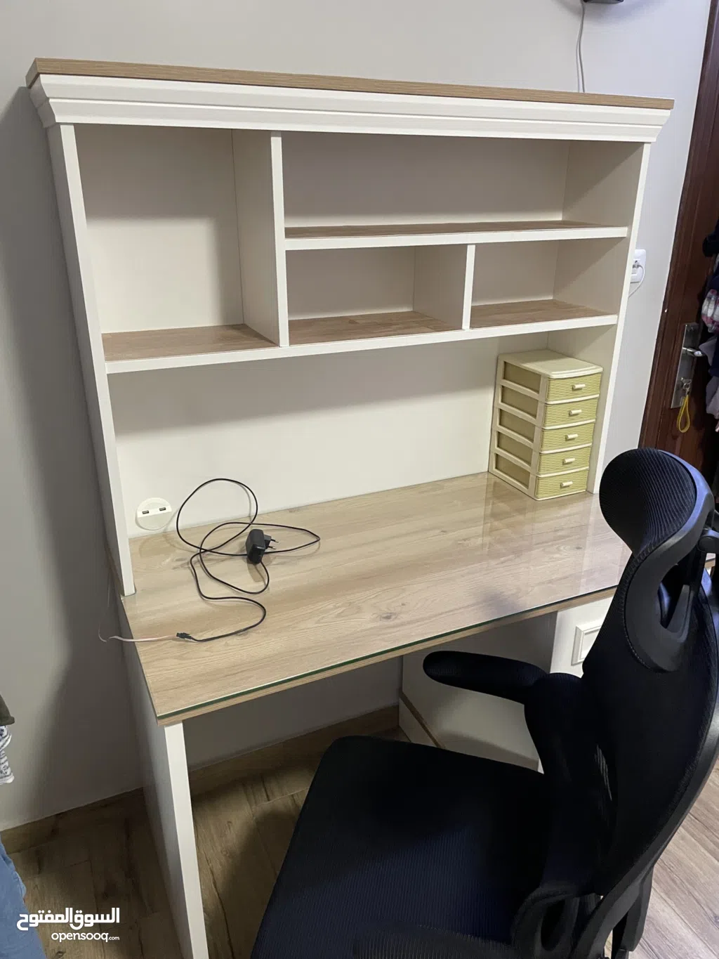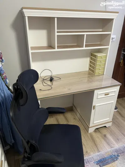مكتب دراسي أنيق مرفق بمكتبة صغيرة للكتب + كرسي مكتب مريح (بحالة الجديد)