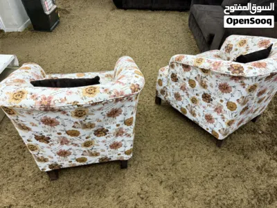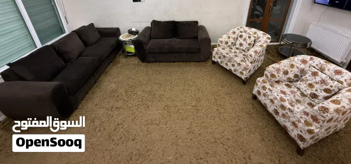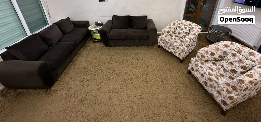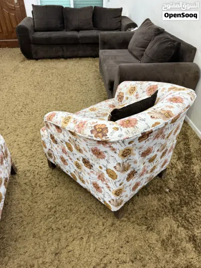 طقم كنب سباعي بحاله جيده اللون بني اما المفردتين كما هي بالصوره بيج فاتح مع رسمات ورد اللون واضح بالصوره الوان متجانسه
