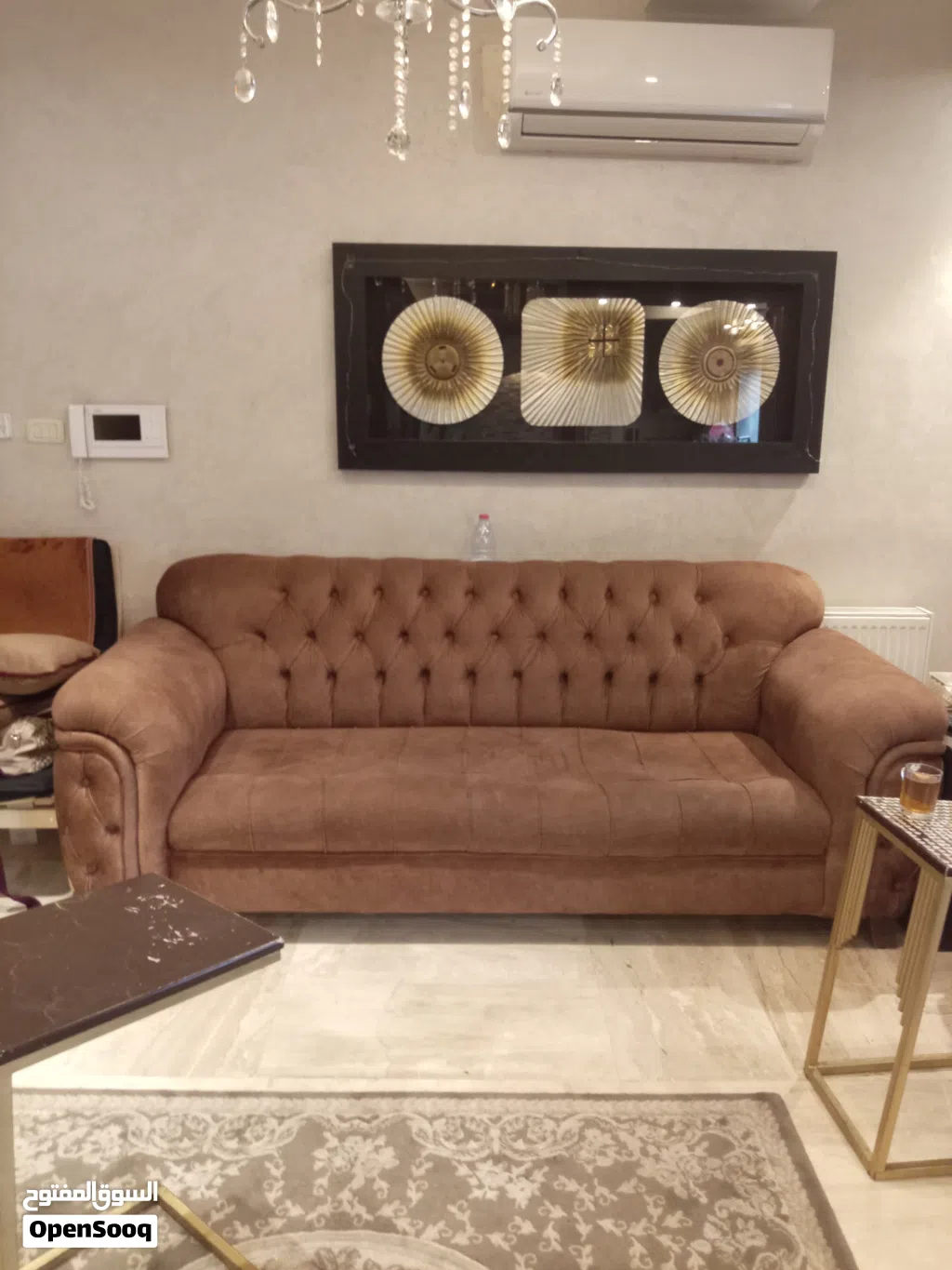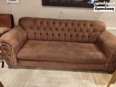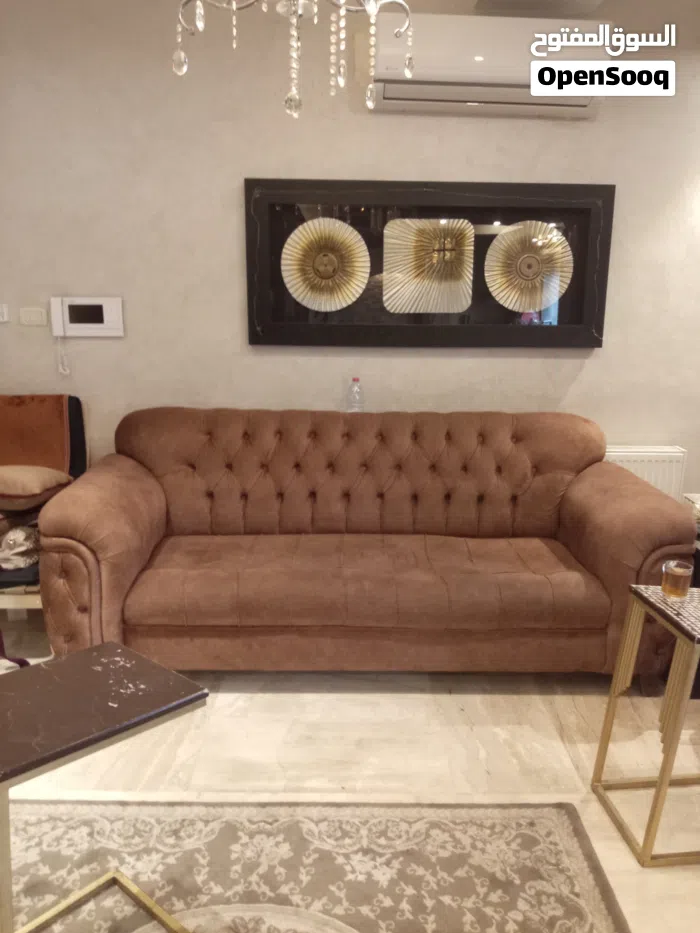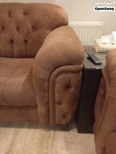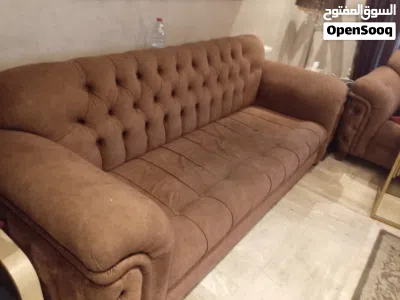 طقم كنب غرفة جلوس راقي عبارة عن مقعد ثلاثي لون بني فاتح و مقعدين سنجل لون بيج فاتح تم شراءه قبل سنة و نصف تقريبا بسعر 550 دينار بالإضافة إلى كرسي هزاز صغير خشبي مريح مع فرش أسود مختلف عن الطقم و تم شراء هذا الكرسي من آيكيا من عدة أشهر فقط بسعر 140 دينار .. سبب البيع السفر
