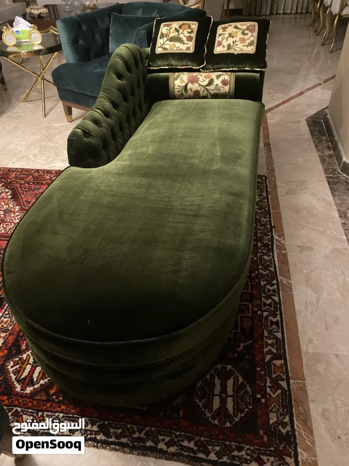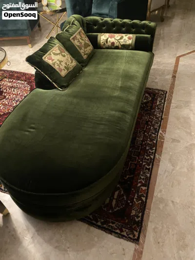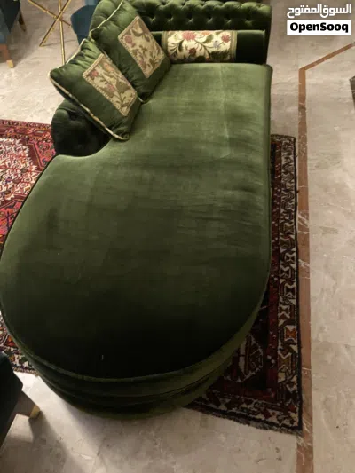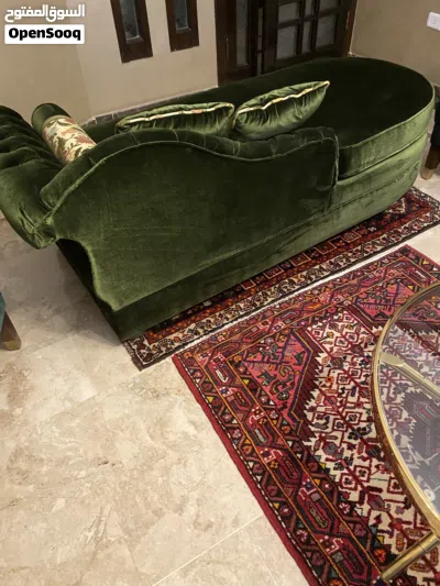 صوفا بلون اخضر غامق، مع ثلاث مخدات ننكن استخدامها كسرير اضافي او توضع كقطعة اثاث جميلة بالصالون او غرفة المعيشة