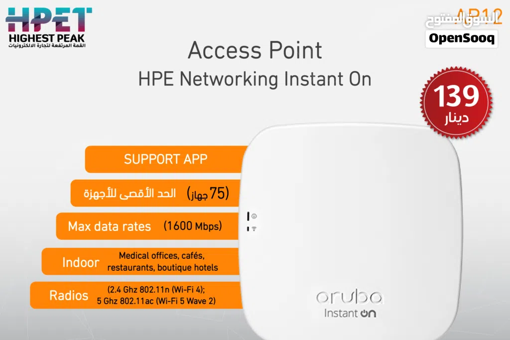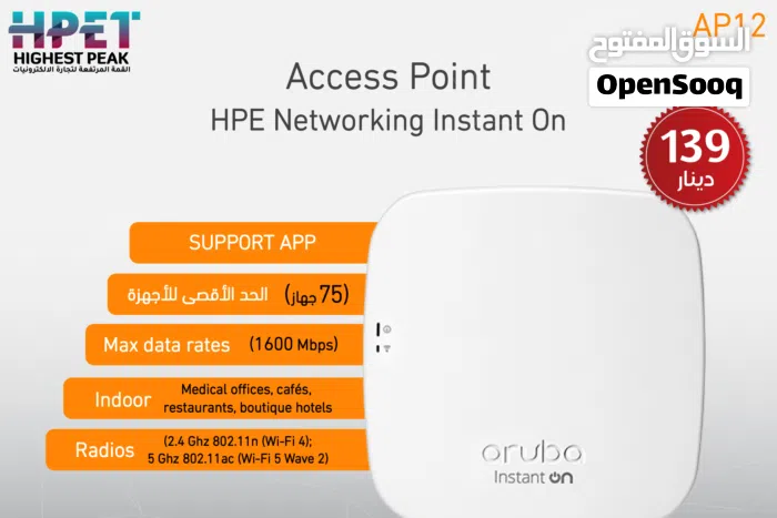 HPE، Instant On، AP12، نقطة وصول، Access Point، شبكة WiFi، WiFi 5، MU-MIMO، حل شبكي للمكاتب، أجهزة الشبكة، القمة المرتفعة، عمان، الأردن، واي فاي سريع، نقاط وصول احترافية