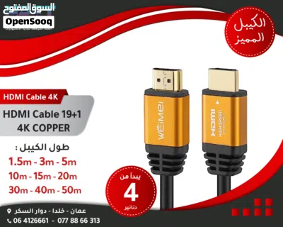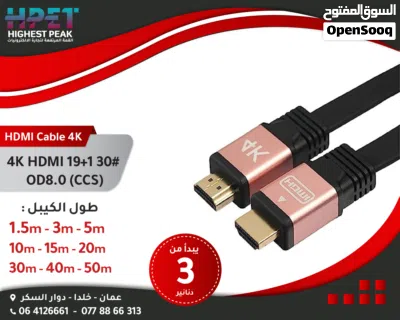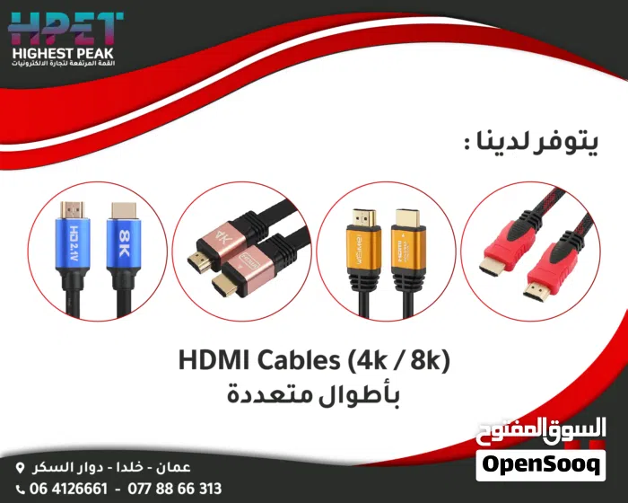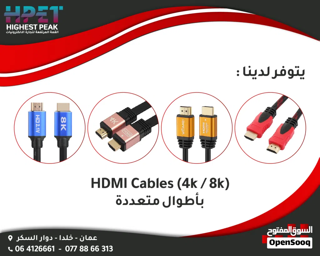 كوابل HDMI، كابل 4K، كابل 8K، كابل اتش دي، توصيل شاشة، كابلات بلايستيشن، كابلات تلفزيون، كابل بروجيكتور، أطوال مختلفة، HDMI Cable، القمة المرتفعة، الأردن، كوابل شاشة