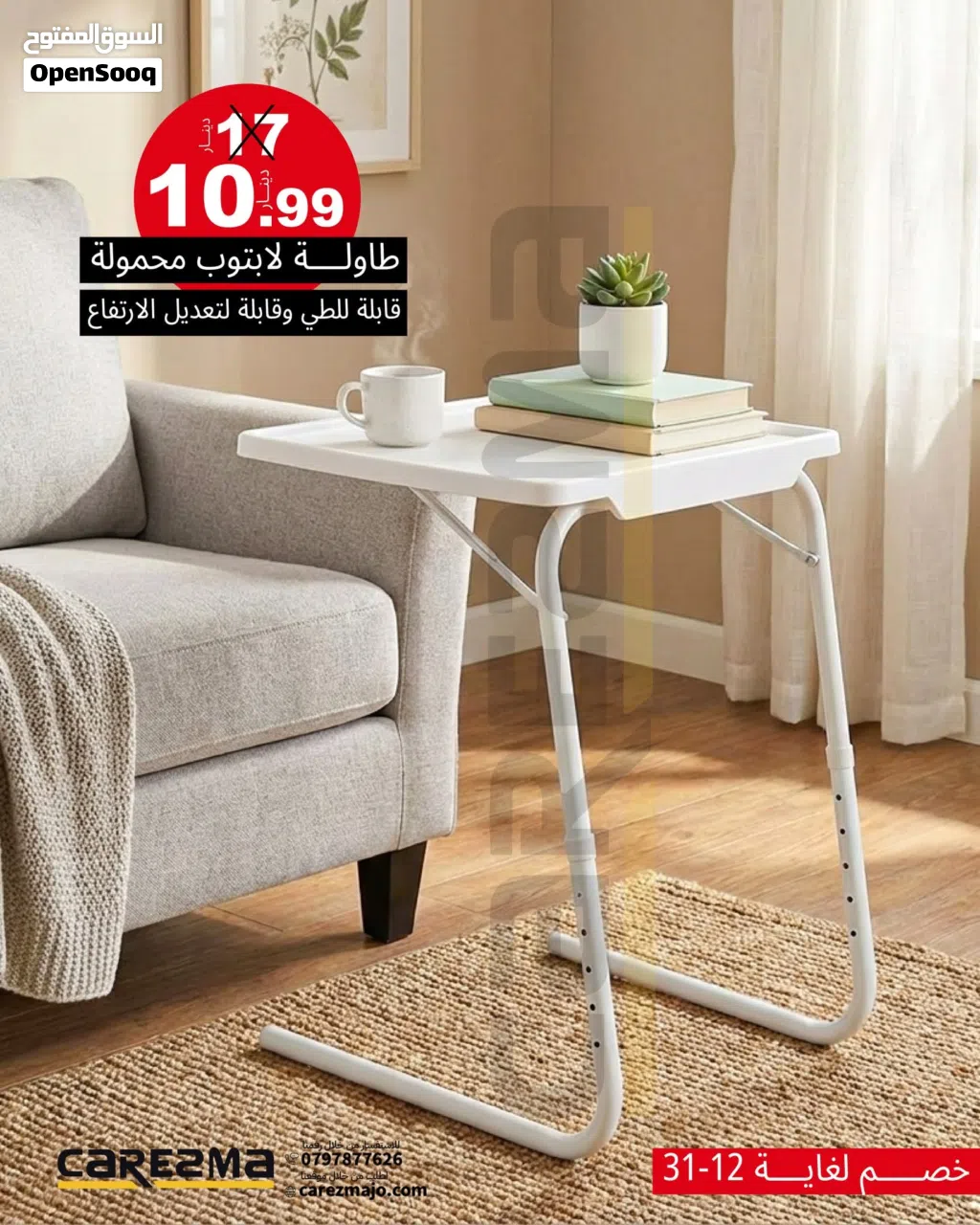 طاولة عصرية بلون أبيض بالكامل بمساحة 40x50cm وارتفاع 47x70cm ويمكن تعديل ارتفاعها وزاوية سطحها لتناسب الاحتياجات المختلفة (مثل استخدامها كطاولة لابتوب أو لتناول الطعام)، سهلة التنقل والحمل، تصميم قابل للطي مما يجعلها سهلة التخزين عند عدم الاستخدام،