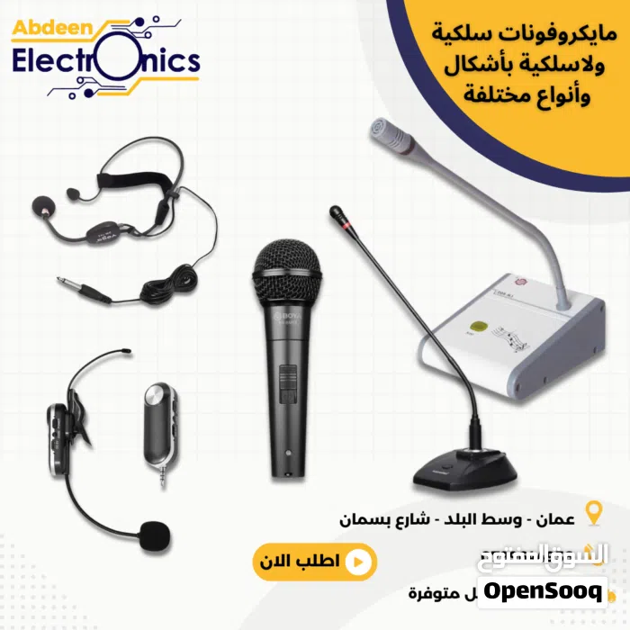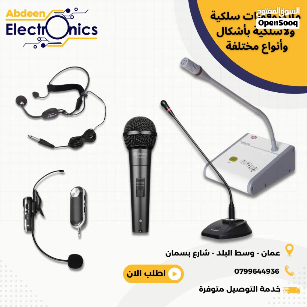 يتوفر لدينا جميع ما يلزم من معدات الصوت (سماعات . مكبرات الصوت . ميكرفونات .ساعات مساجد وساعات رقمية ) وجميع الاكسسوارات للصوت